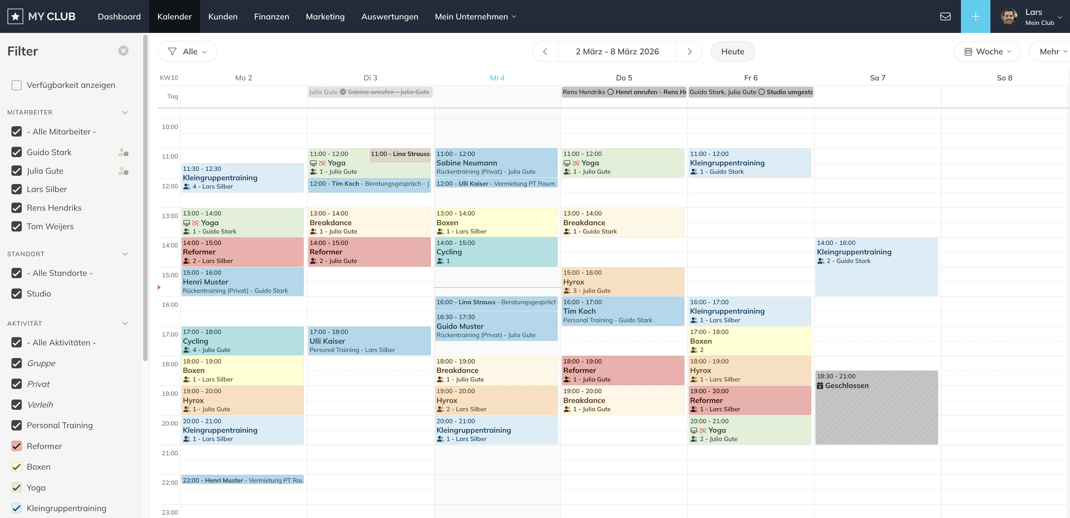 Filter nach Aktivität, Standort, Instructor, Status, wiederkehrenden oder einmaligen Sitzungen